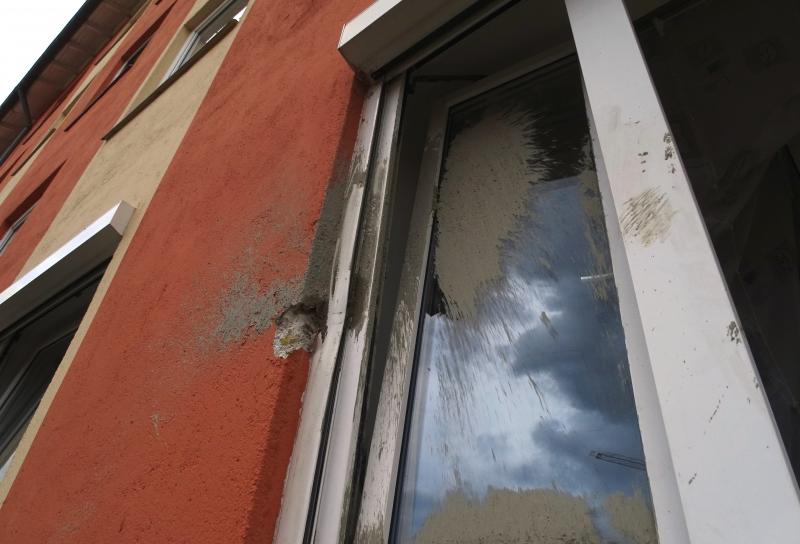 Ein Baukran beschädigt zuerst Fenster und gießt anschließend Beton in eine fremde Wohnung