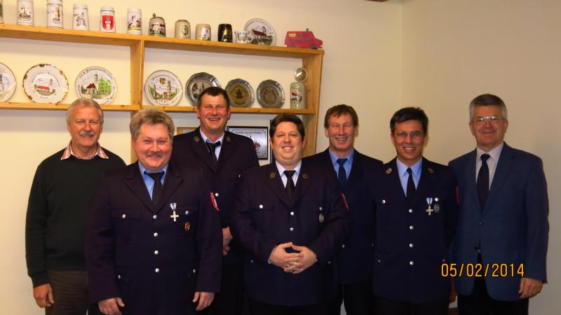 Auf dem Bild von links der zweite Bürgermeister Roland Müller, erster Vorstand Franz Walch, zweiter Kommandant Peter Wiedmann, erster Kommandant Thomas Forster, zweiterr Vorstand Peter Hofer, Schriftführer Klaus Asam und Feuerwehrreferent Leonhard Hainzinger.